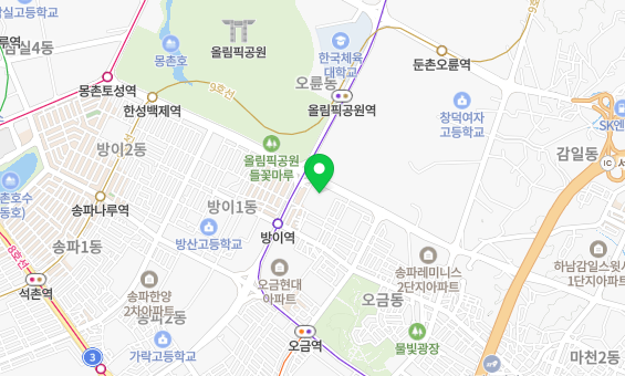 - 가장 가까운 지하철역과의 거리: 425 $\text{m} $ 방이역(5호선), 올림픽공원역(5호선, 9호선)